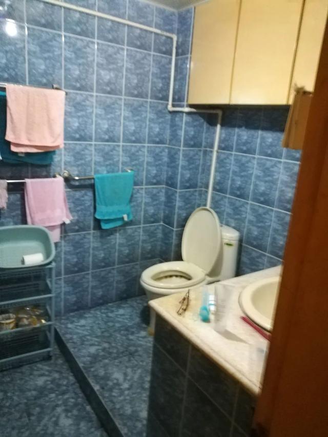 改造前的卫生间,置物架太多、水管外露、瓷砖颜色太深,整体使用感觉不佳。