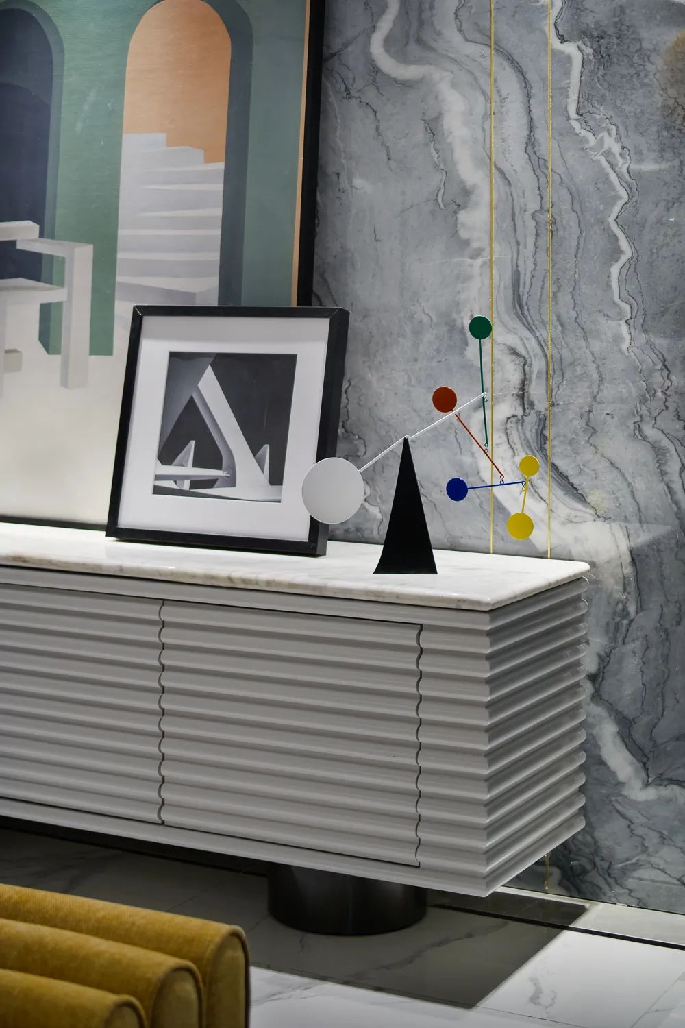 ▲电视墙是对称图案的大理石背景,灰白配的纹理线条,布置端庄优雅的电视柜,还布置了立体几何感的装饰画与摆饰品,与现代活泼的整体布置相呼应,带来的是一种高级优雅的空间感。