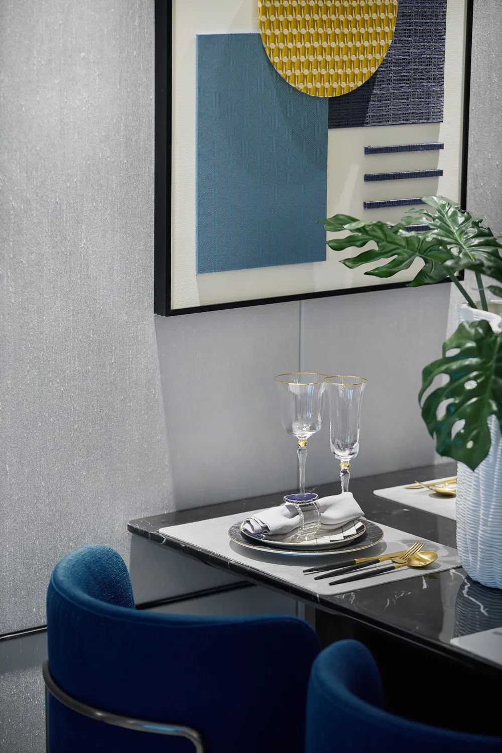 ▲餐桌上精致的餐具、酒杯与花瓶,也布置出一种雅致温情的用餐氛围感。
