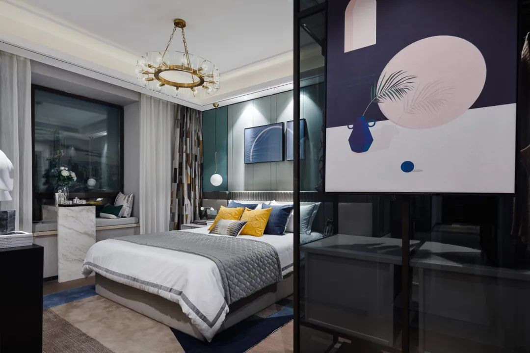 ▲床侧边的斗柜,圆弧的柜体设计,布置精致的花瓶与摆饰,还有一幅简约优雅的装饰画,鲜艳的配色与端庄华丽的质感,带来的是一种成熟优雅的高级感。