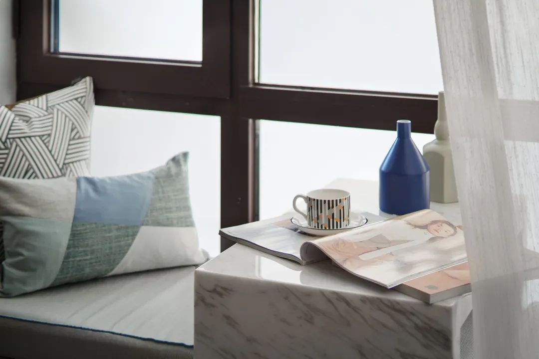 ▲飘窗的大理石茶台,搭配舒适的飘窗坐垫,把飘窗布置成一个优雅情趣的喝茶聊天小空间。