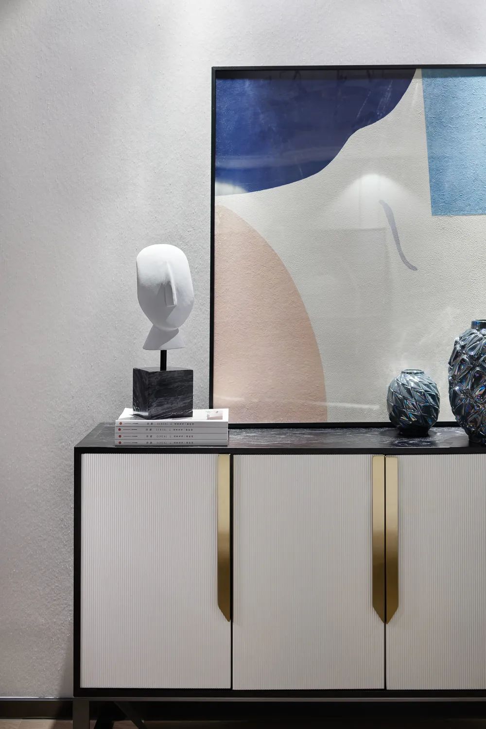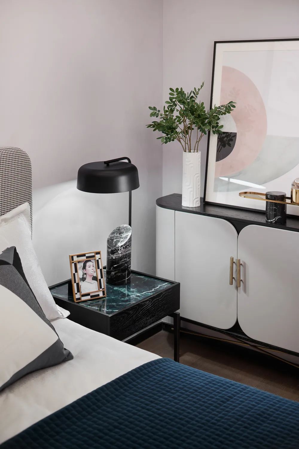 ▲床尾的斗柜黑色柜体+米白色柜门,柜门还有金属质感的拉手,台面上布置花瓶与陶艺装饰头像,靠一幅静雅端庄的装饰画,营造出一种温馨华丽的高级浪漫气质。