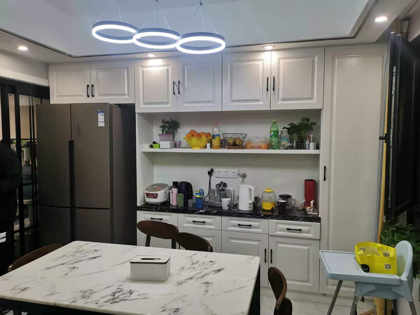 ▼餐厅,大理石面餐桌高级感满满,吊灯个性时尚,搭配在一起也是别有一番风味。餐桌边的墙面做了满墙收纳,很实用,中间部分留空用来取放一些常用物品,非常方便。