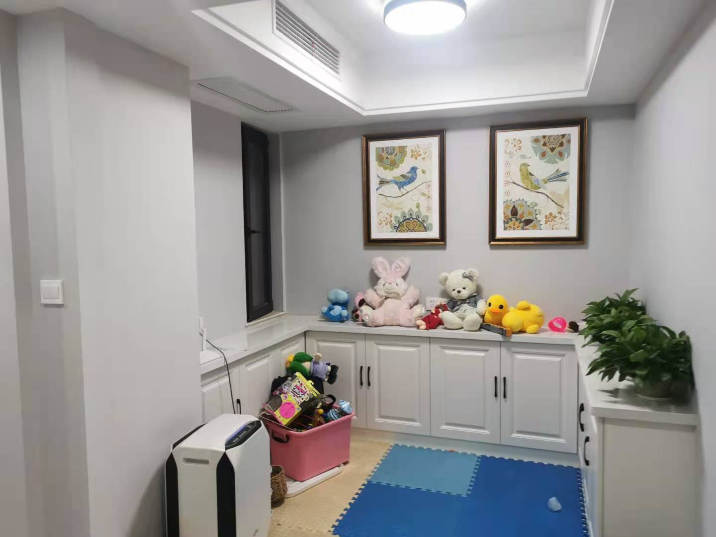 ▼这个房间暂时是用来给宝宝的玩的,所以地上还铺了垫子,四周一圈的矮柜辅助收纳,上面摆放着很多孩子喜欢的毛绒玩具。