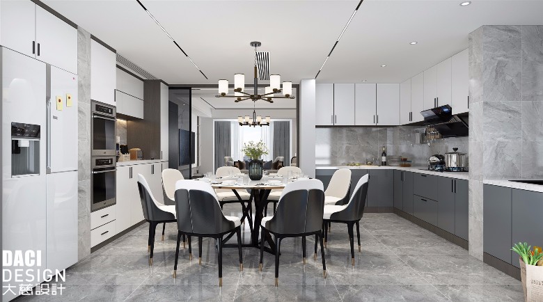 白色为主的西厨,灰色为主的中厨夹杂着黑色门把,无需绚丽多彩的颜色,就能让人耳目一新。黑白灰一直都是经久不衰的永恒,以低调的态度传达着独一无二的经典。