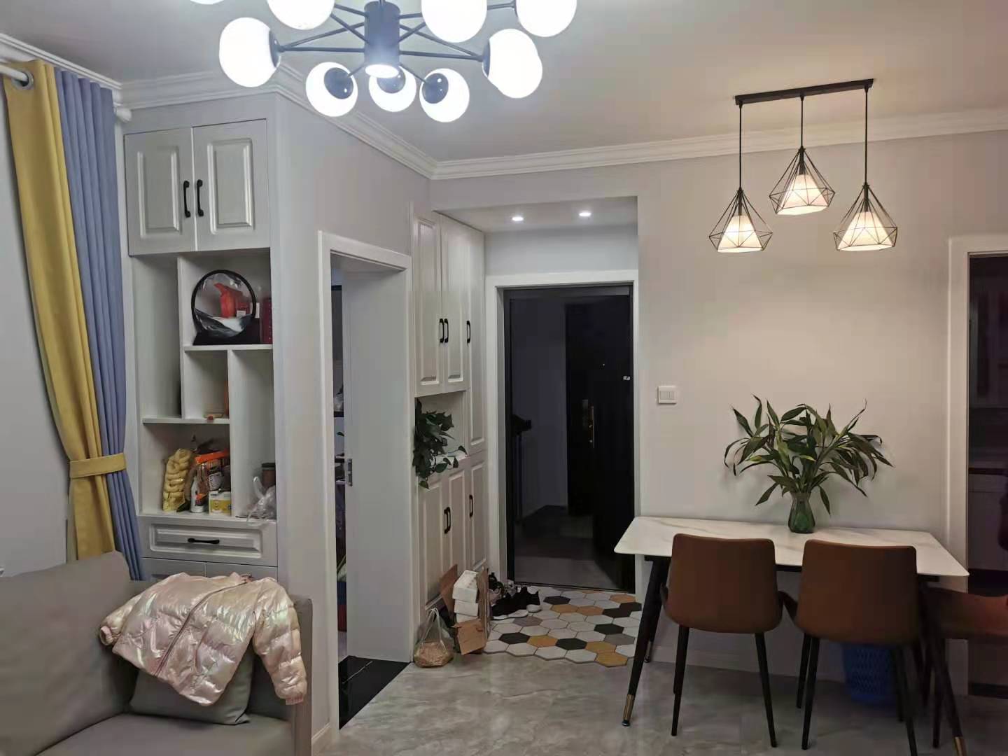 ▲进门玄关做了嵌入式鞋柜,节省空间,中间留空方便放东西。进门右手边就是厨房,左手边就是餐厅,非常方便,个性吊灯增添用餐氛围。