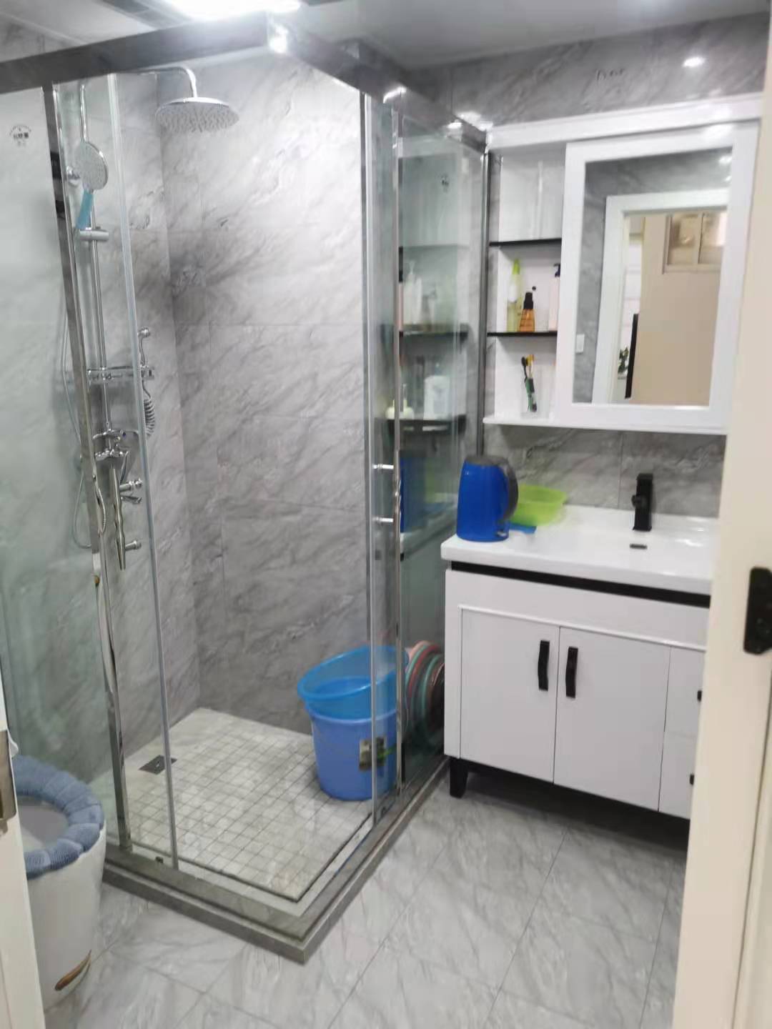 ▲洗手间不大,所以做了个正方形的淋浴,节省空间,同样白色洗漱台,更显清爽。安装的镜面柜增强收纳空间,非常棒!