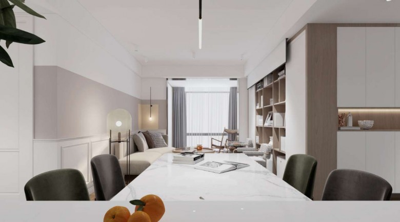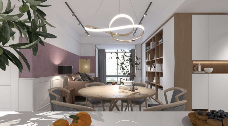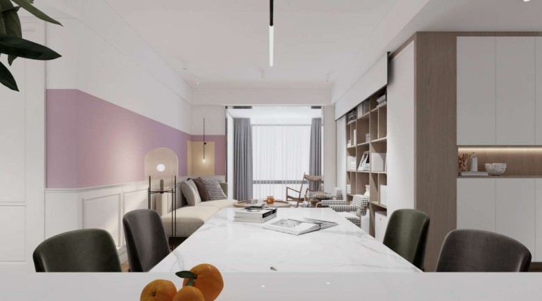 客厅的颜色设计师给了两个版本,一个看起来活泼惊艳,一个看起来温柔沉醉。我选了后期好换软装颜色的图2。结合我提的要求看起来整洁的要求,设计师把沙发的颜色、灯具、桌子颜色做了调整,以白色为主。我其实想要极简风格,但设计师对我的生活惯比较了解(不是那么勤快),劝我还是不要极简风。