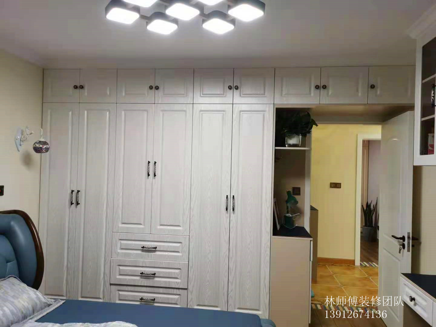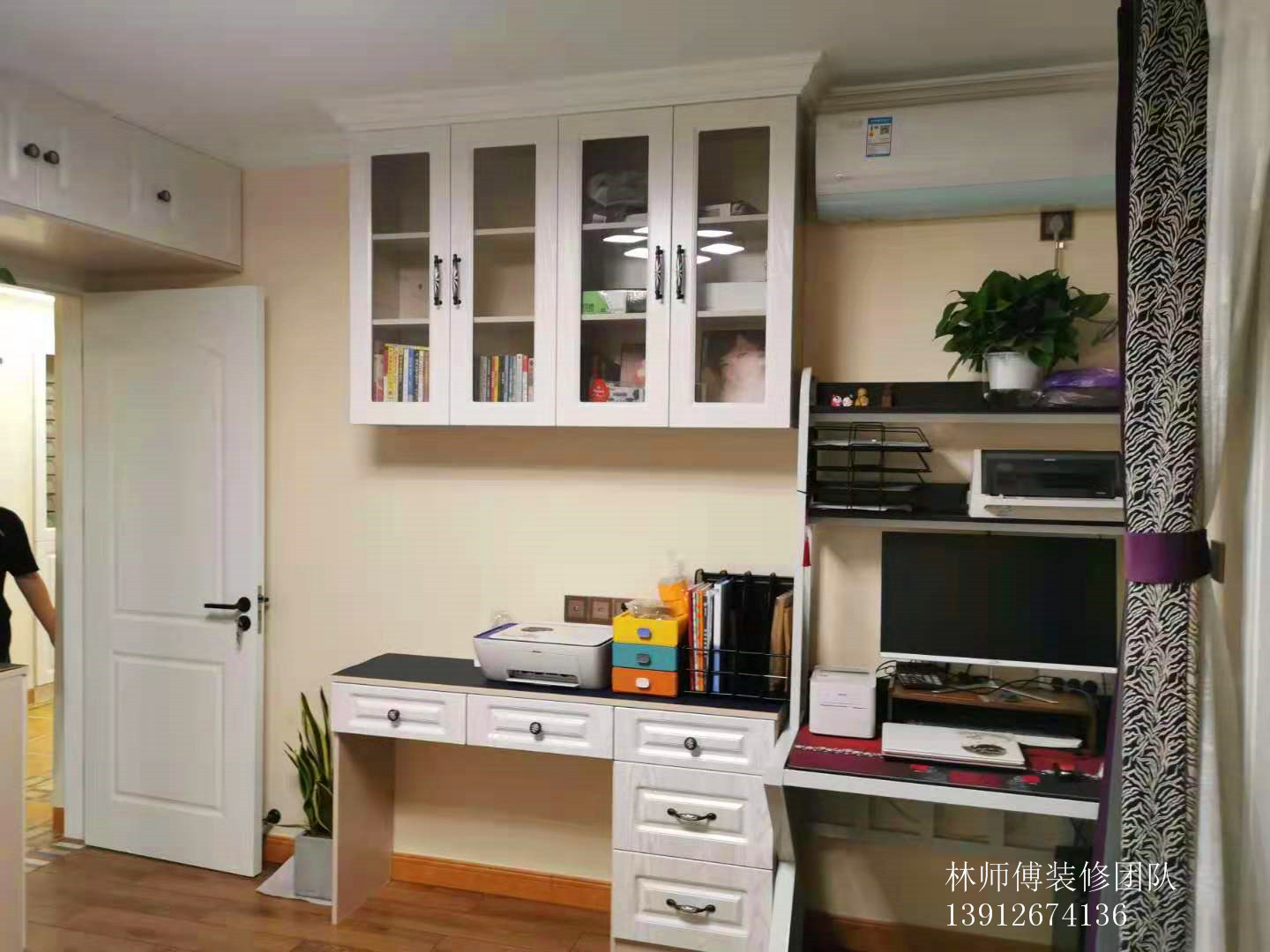 次卧,粉色墙面、香槟色橱柜,显得非常温馨。窗户改造成衣橱,两边是橱柜,中间作为书桌使用,采光也不错哦。