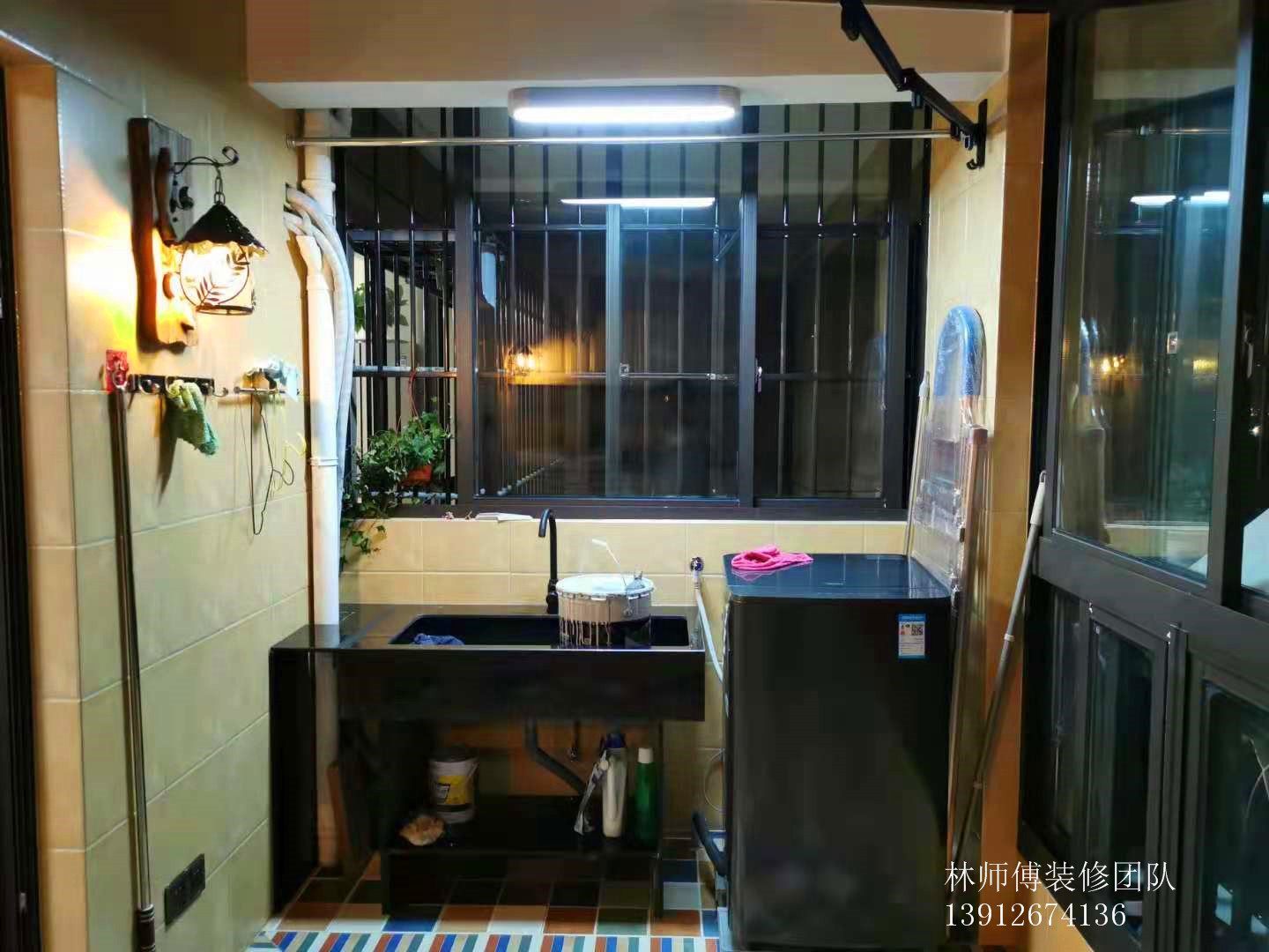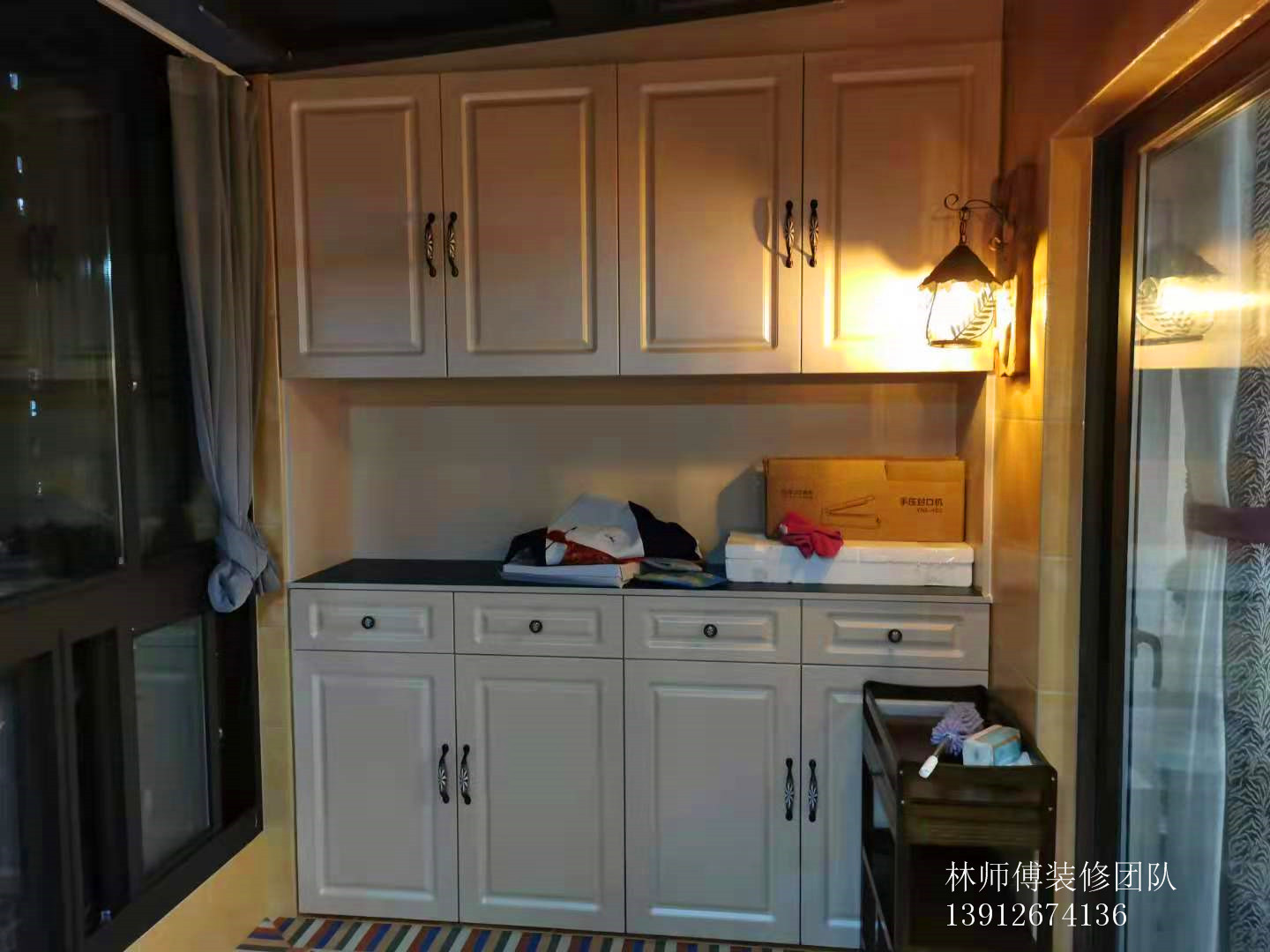 阳台的一边做了橱柜用来收纳,复古壁灯美式感满分。