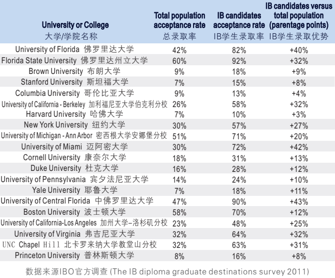 国际文凭课程组织的调查显示,IB学生进入常春藤联盟大学的录取率比总录取率高18%。对于排名靠前的非常春藤盟校的大学来说,IB学生更容易被录取。在大学选拔过程中,IB学生会更有综合竞争力。