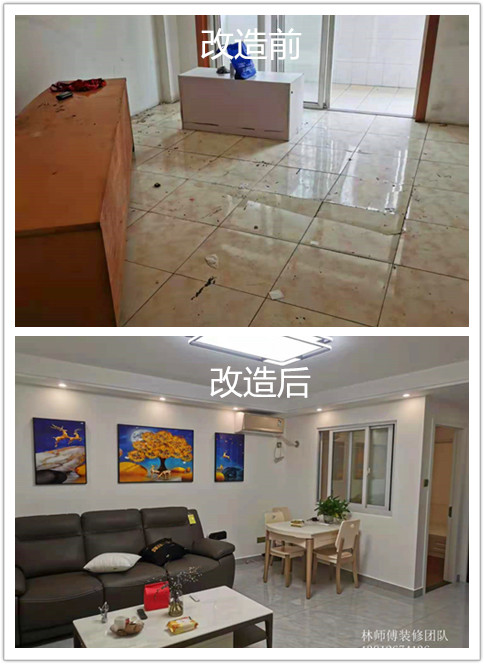 原本的客厅黄色瓷砖显得又老又旧,而且没有做美缝,缝隙都发黑发霉,非常难看。改造后的瓷砖用的大砖,整体性更好。而且灰色又是比较流行的颜色,时尚大气。皮质沙发很显档次,背景墙上挂了三幅装饰画,颜色亮丽,充满生机。餐桌靠墙摆放,节省空间。