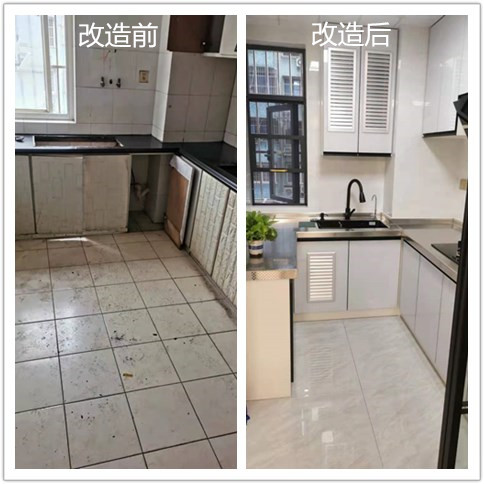 原本的厨房也是又脏又乱的,经过改造后瞬间就很清爽了。白色的地面和橱柜,干净又整洁,不锈钢台面耐磨好打理。厨房原来的L型设计变成了U型,增加储物能力。