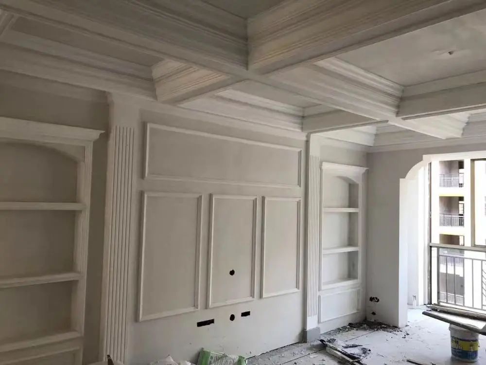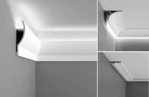 想省装修钱,就不要做复杂造型的吊顶,如果你家层高低于3.2m,那更不能做了!家里不吊顶后有些人会一时间难以适应,总觉得设计太单调,不显精致。其实你可以在墙面与天花交界处选用带有空槽的石膏线用来提升顶面质感,石膏线外侧的精美造型可以起到很好的装饰作用。