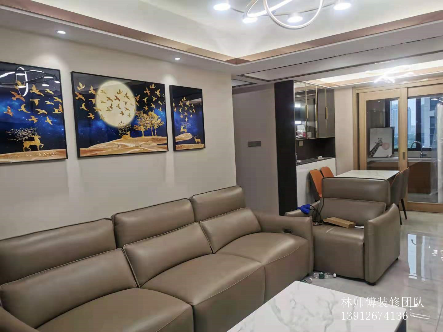 客厅的咖啡色皮质沙发,大气时尚,背景墙上的三幅画与玄关的装饰画,色调一致,整体统一。