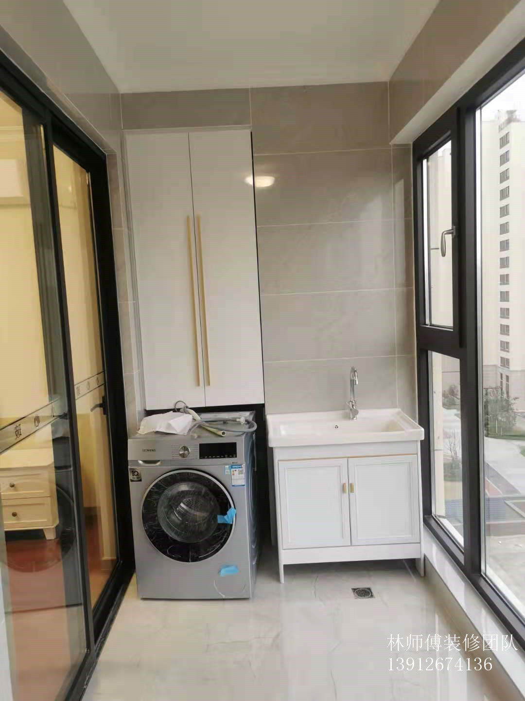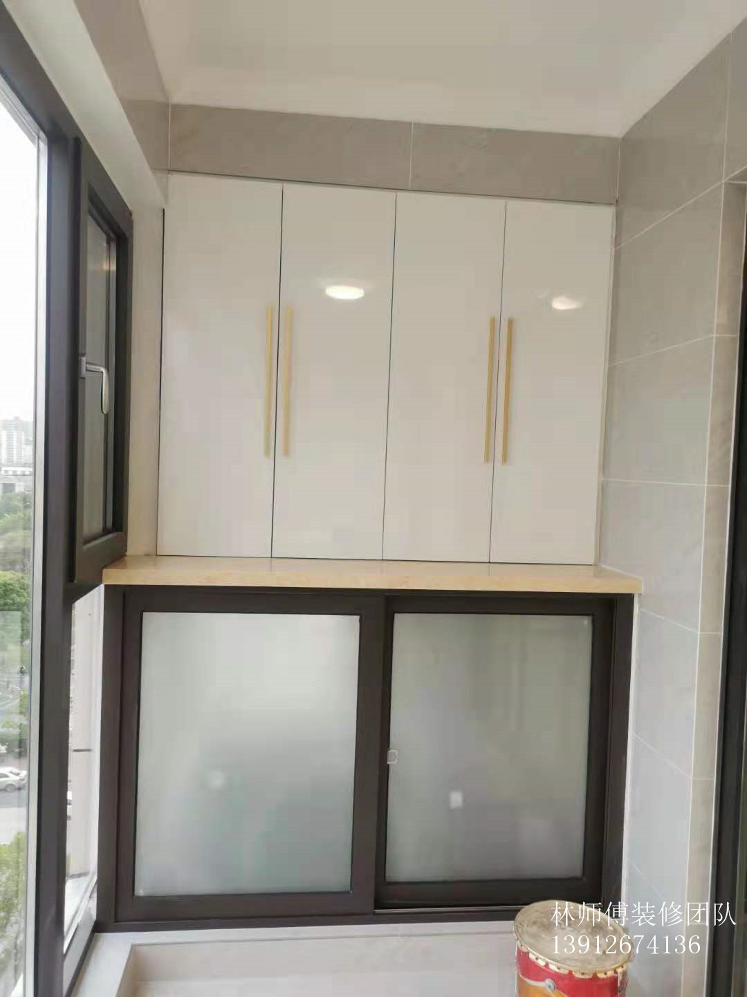 阳台也是,阳台两边的空余地方都做了收纳。内嵌式的橱柜,非常美观,而且整体性非常好。