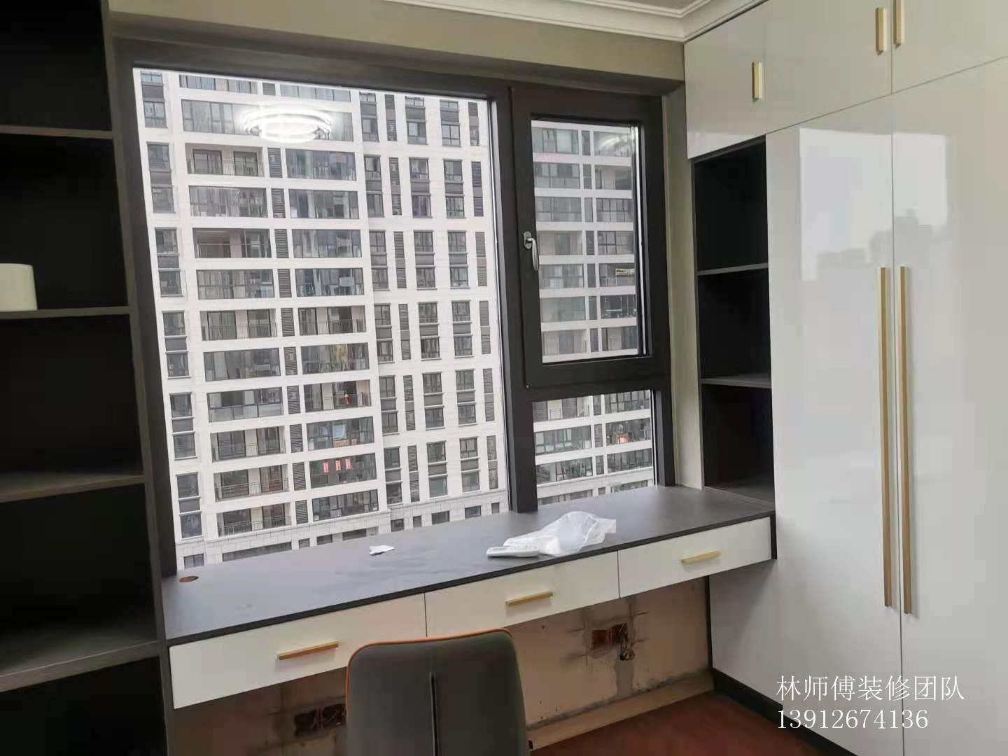 房间四,这个房间兼具了书房的功能,靠窗的地方做成了书桌,光线好。两边是半开放式橱柜,方便以后放书。双人书桌,可以满足两个孩子同时使用。