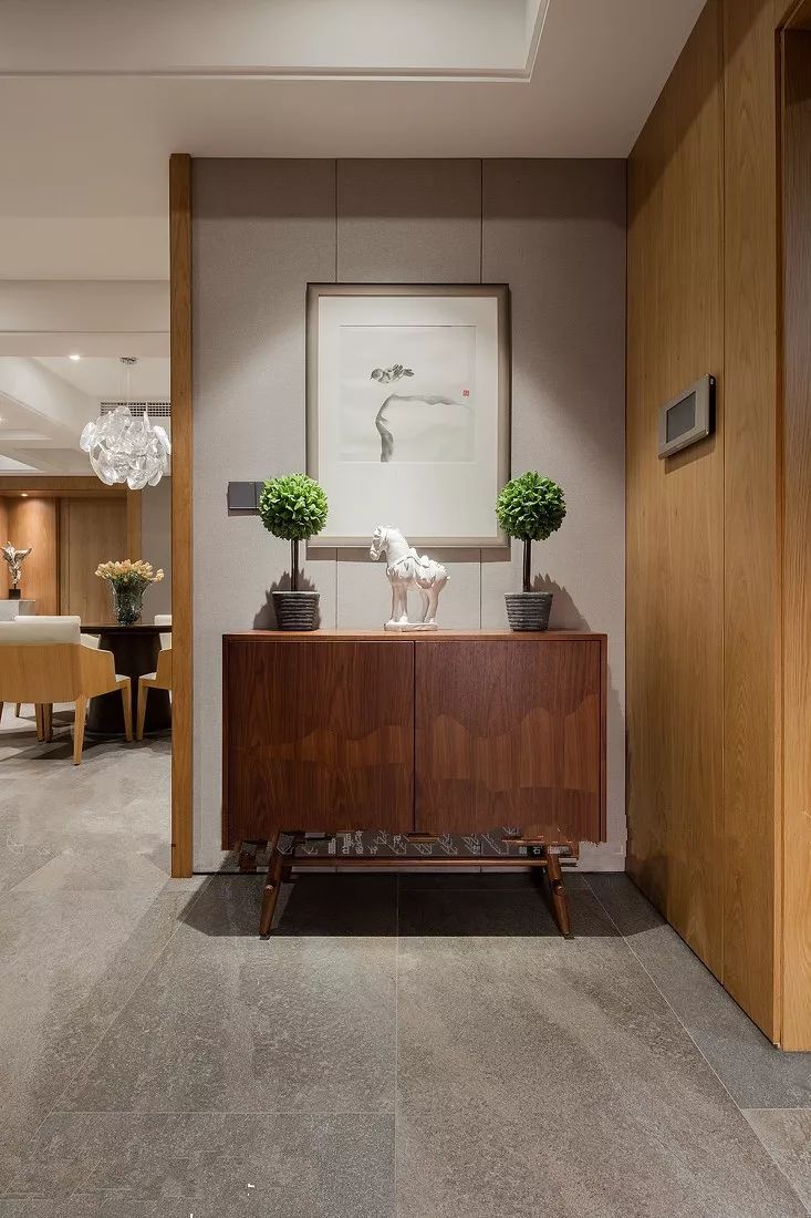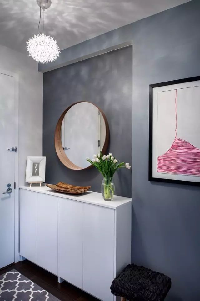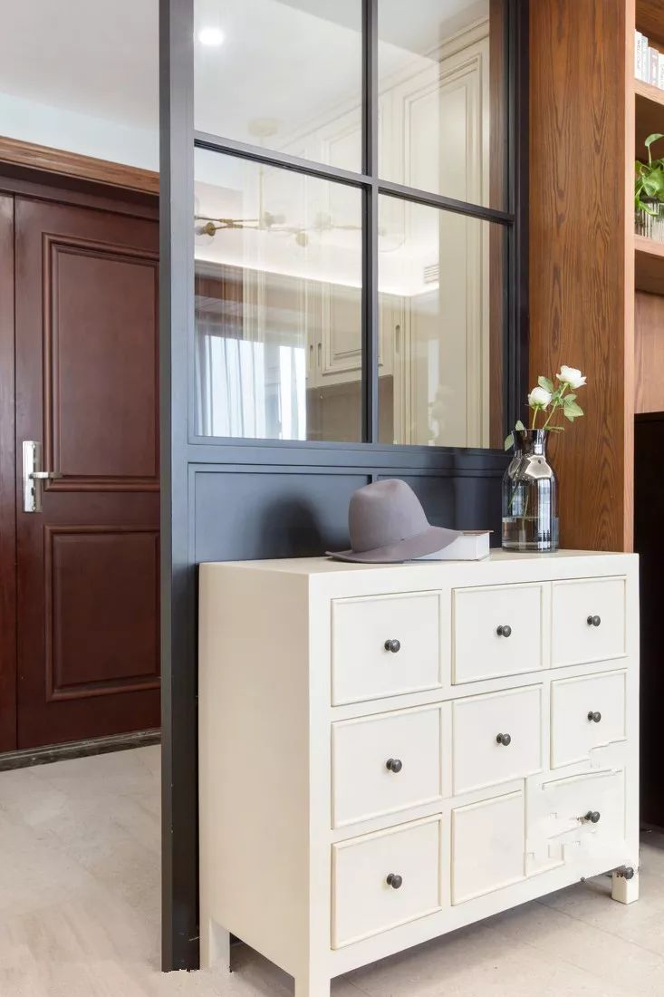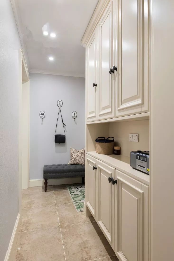 这样中间和柜底悬空的设计,中间放绿植、相框、钥匙、零钱的,底部放常穿的鞋子,其他封闭起来的柜子都可以当做收纳柜。
