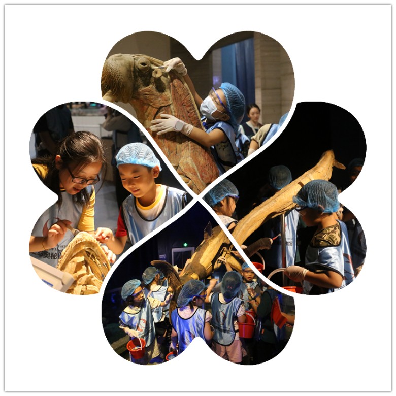 这一晚,小小探索员们拎起小桶,拿起刷子,开始了“喷喷喷,刷刷刷”的清理标本任务,庞大的鲸、憨态可掬的海豹、坐镇博物馆C位的大海象在孩子们的辛勤劳动下“焕然一新”。动物标本无毒、无味,还可以触摸它们,在清理的过程中,不仅体验了一把标本维护师的职业,也可以更近距离地观察自然动物
