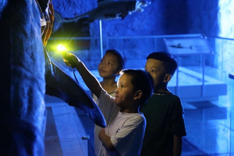 夜探博物馆当然少不了神秘,一楼海洋之魂展区藏有数颗闪闪发光的夜明珠,小小探索员们拿起手电筒开始了奇妙的探寻之旅。