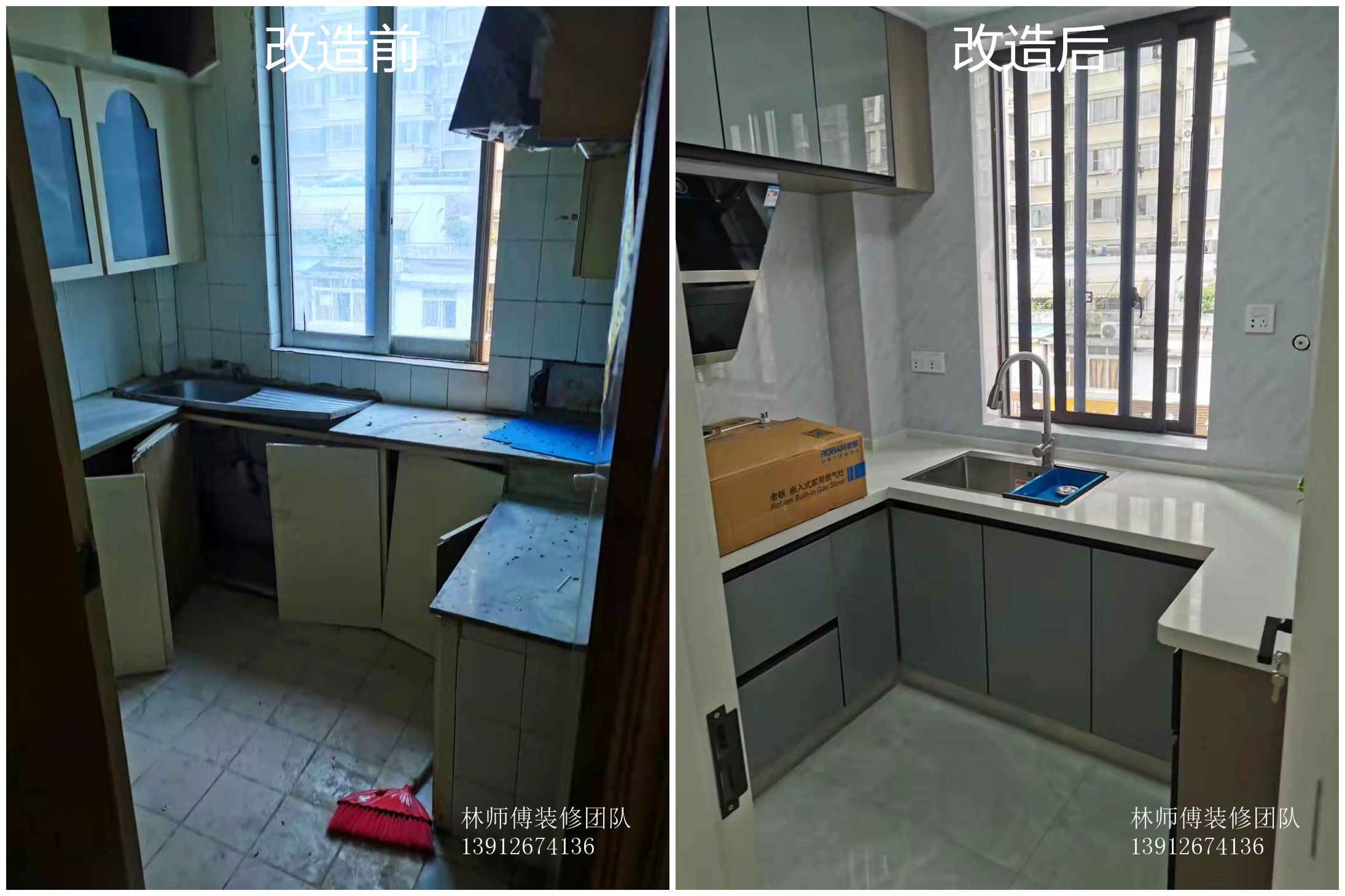 原来的厨房用的时间久了,油污比较严重,地砖、墙砖的缝隙也都变黑了,在这样的环境下做饭,心情都变差了。改造后的厨房,白色的台面,白色的瓷砖,显得整个厨房都非常干净整洁。U型设计,动线合理,收纳充足,完美!