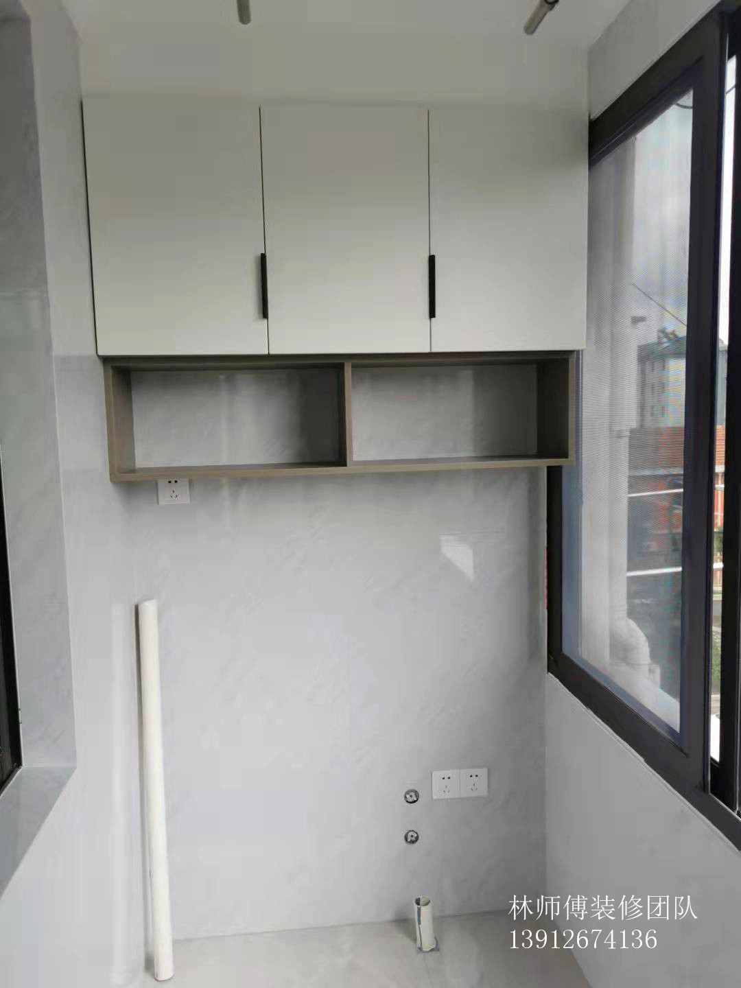 阳台改造一下也变得非常清爽、美观。阳台主要还是以洗晒为主,满足日常需求即可,墙面吊柜的设计也是为了满足日常阳台的收纳。