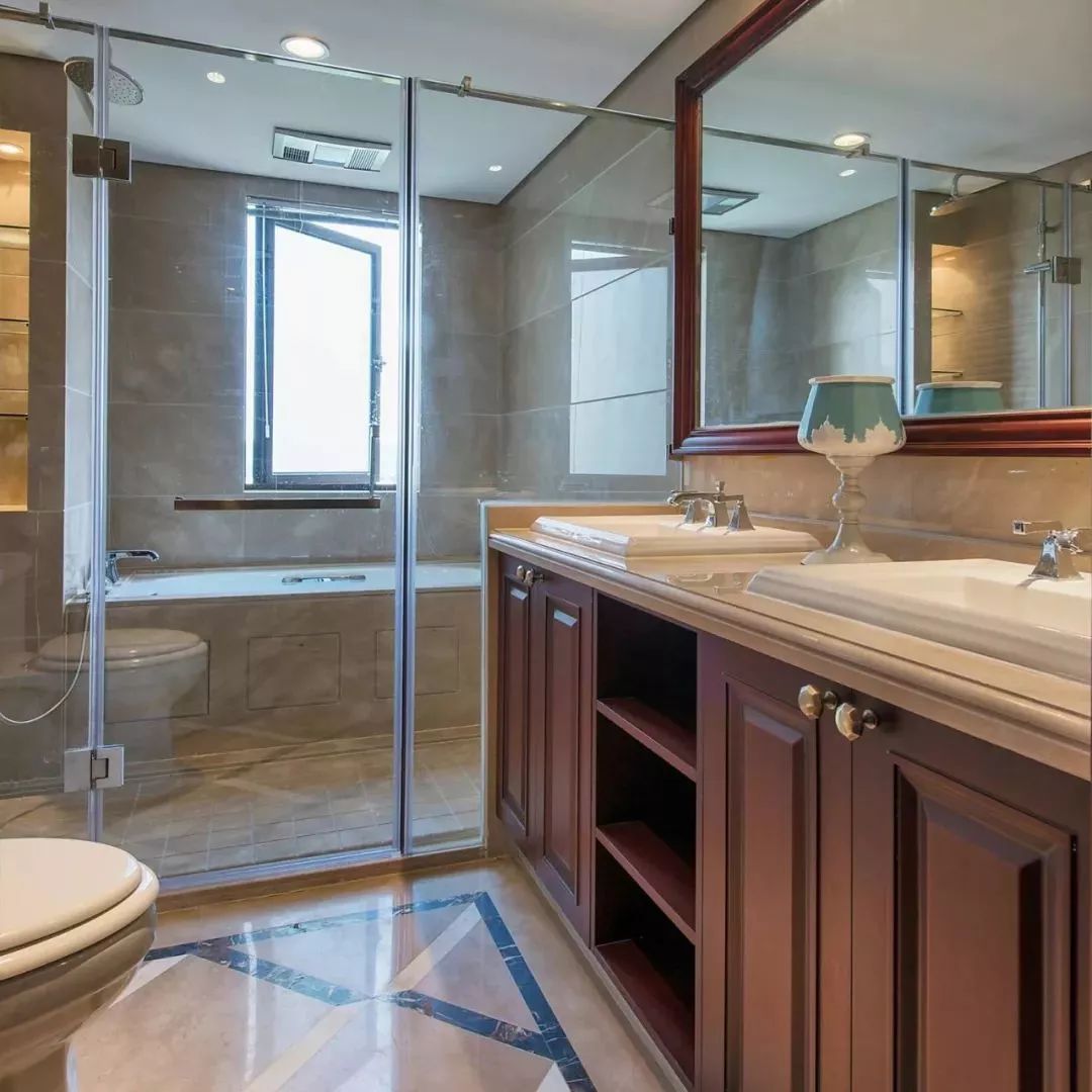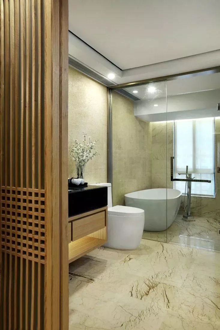 卫生间比较宽敞的,还可以在淋浴房内多装浴缸,玻璃隔断把浴缸、马桶和洗手台都给分开,但看起来还是在同一空间内。
