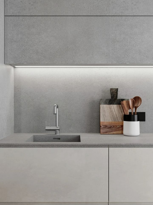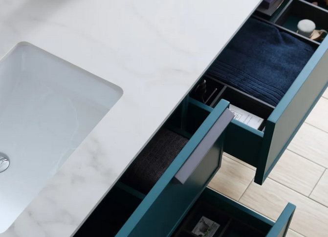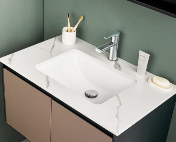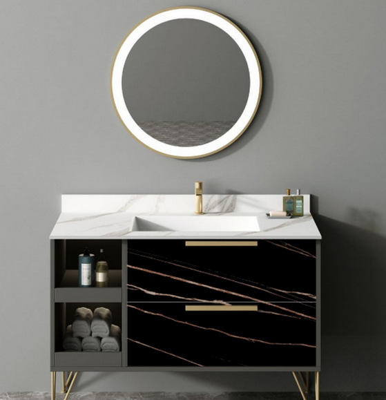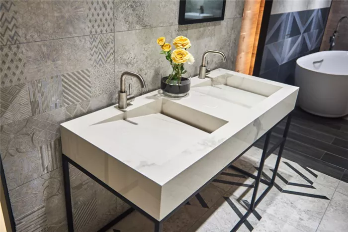 浴室柜也是家里的“死角”,特别容易潮湿脏污。岩板高密度不沾灰、表面无孔污渍无法渗透、易打理的特性,用在浴室柜的台面上,再合适不过了。