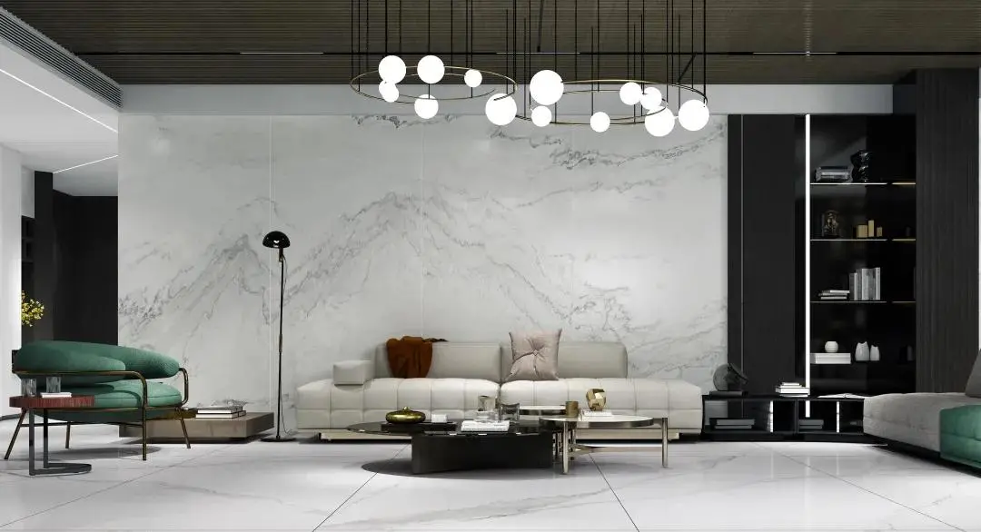 小齐建议客厅岩板背景墙选择3mm~6mm规格,相比于小规格瓷砖的铺贴,3600×1200mm×3mm、3200×1500mm×6mm等大规格的岩板,单独作为背景墙更显大气。