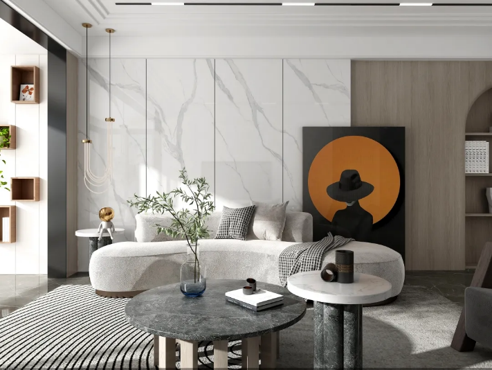 客厅是家庭休闲娱乐和接待客人的重要场所,采用一片到顶的岩板装饰客厅背景墙,能够最大程度地减少拼接痕迹,天然纹理元素赋予空间艺术氛围,很好地展现居住者的品味和档次 。岩板耐污易清洁,完全不用担心卫生问题,光滑的表面一擦拭即干净,长久使用依旧光亮如新。