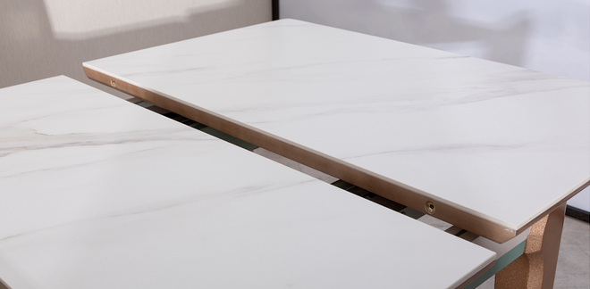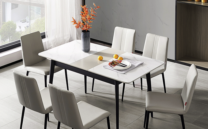 伸缩岩板餐桌设计。餐桌伸缩设计,为小户型带来更多便利。轻轻一拉,桌面灵活伸缩延长,可满足多人就餐。加上顺畅静音滑轨,拉伸不费力不卡顿,一个女生也能轻松搞定。以防桌角磕碰,有小孩的家庭建议选择圆弧桌角岩板餐桌。