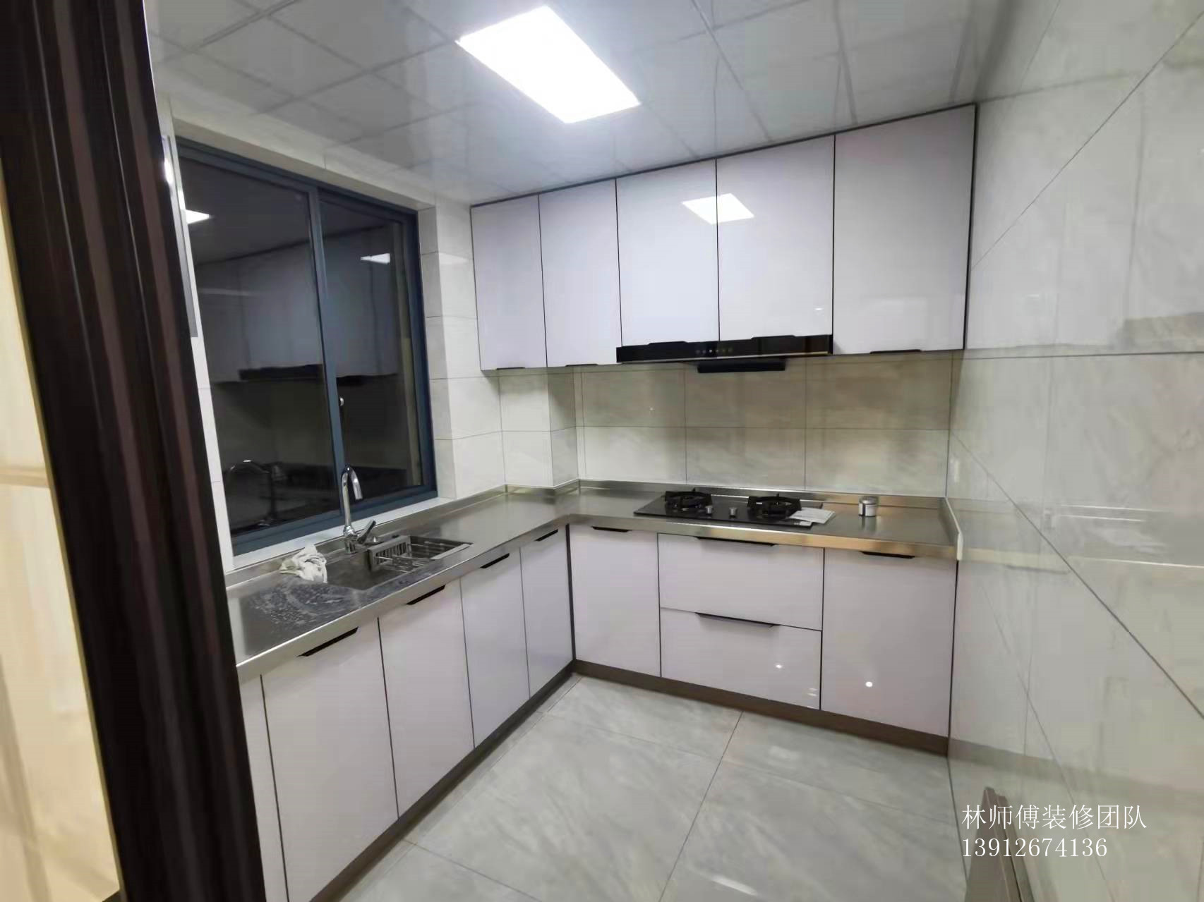 厨房设计的L型,收纳也比较充足,不锈钢台面好用又好打理。整个厨房间看起来干干净净,非常整洁。
