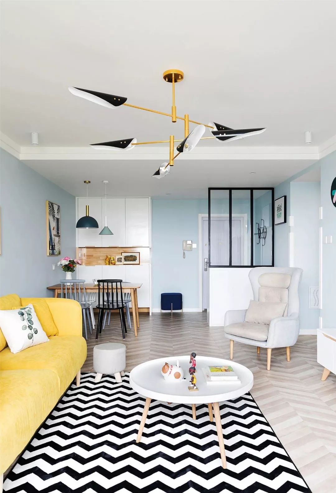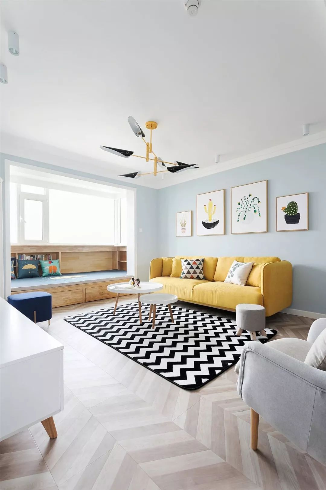 ▲ 客厅主要是以淡蓝色为主,搭配黄色布艺沙发,让人眼前一亮的感觉。