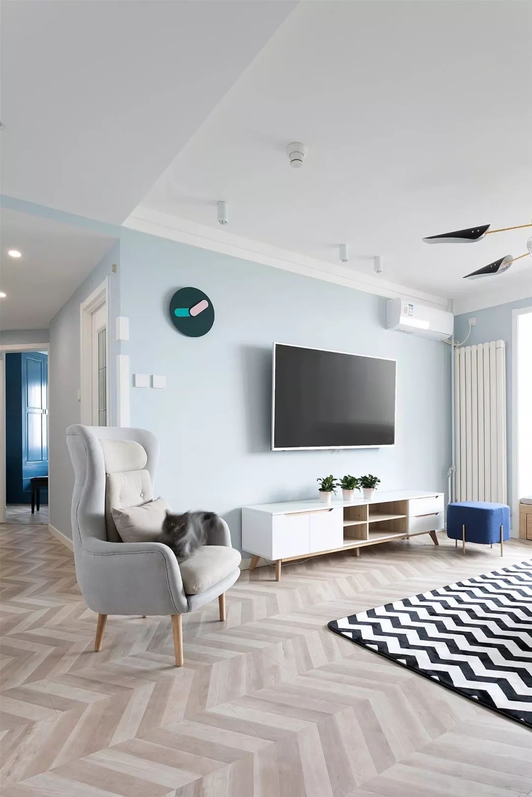 ▲ 淡蓝色电视墙搭配白色的电视柜,再摆放几盆小绿植,简洁清新又文艺。