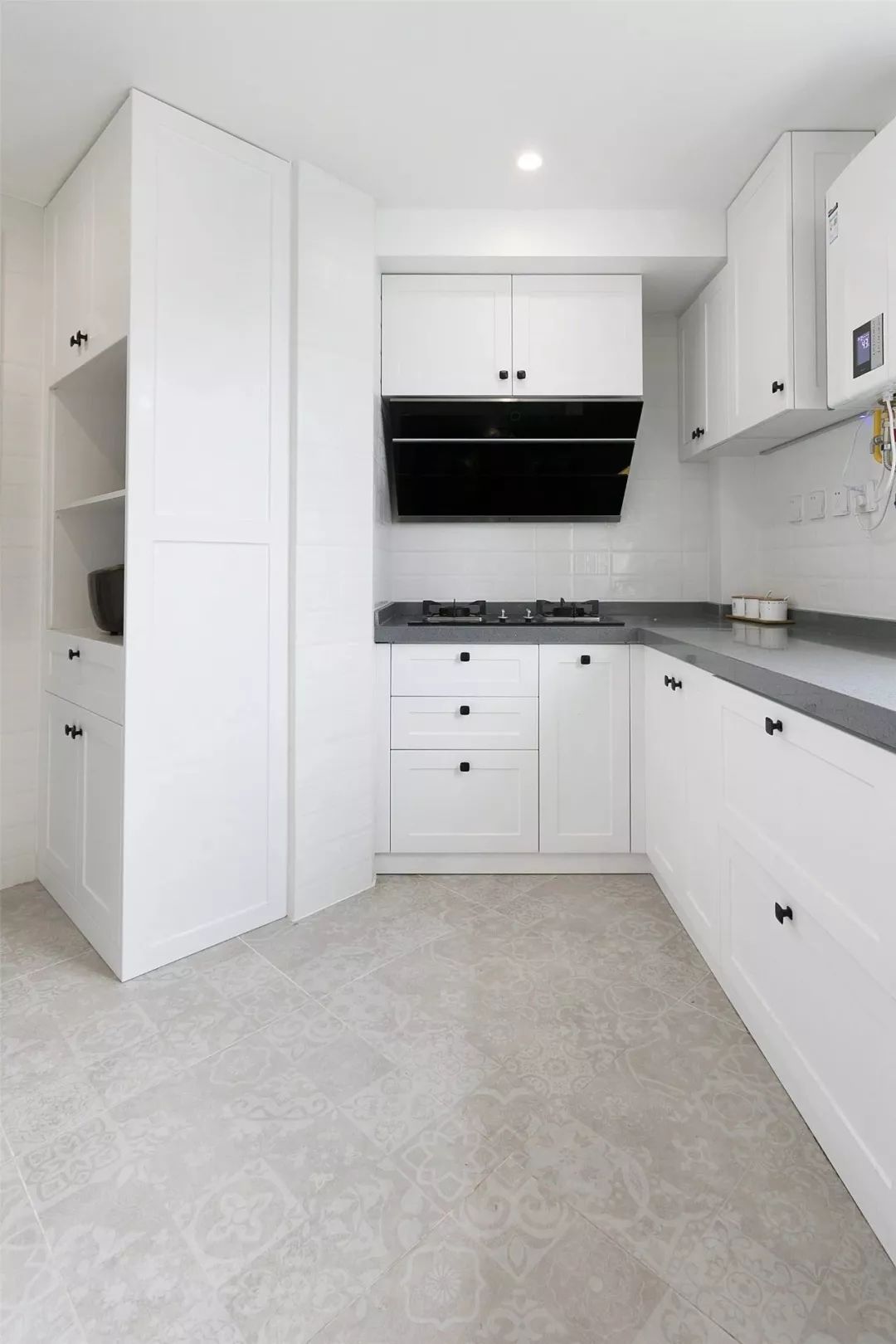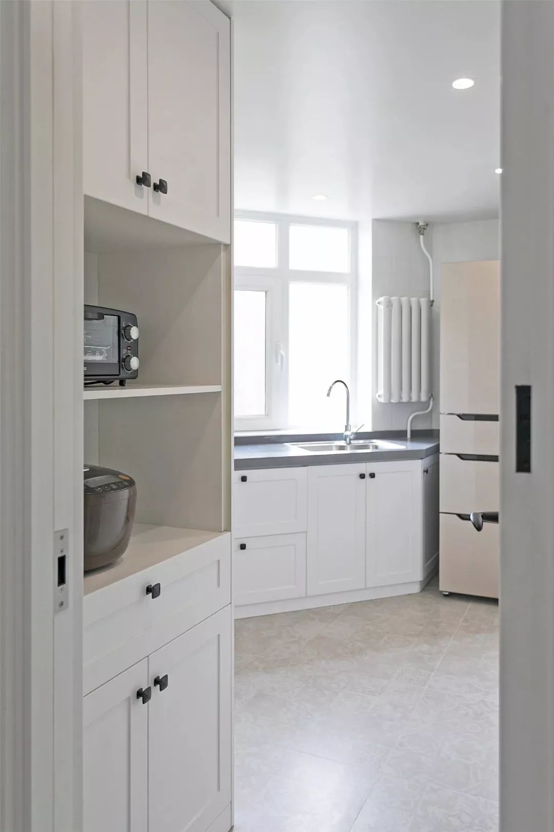 ▲ 利用厨房进门左侧的空档位置设计了一个电器高柜,增大储物功能。