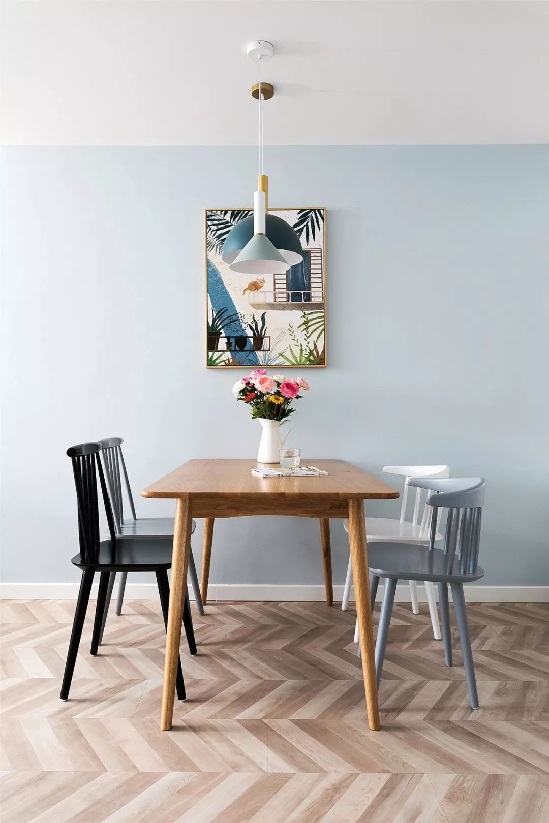 ▲ 原木色的餐桌,多色餐椅,餐桌上的鲜花+墙上的挂画整个餐厅尽显清新文艺感。