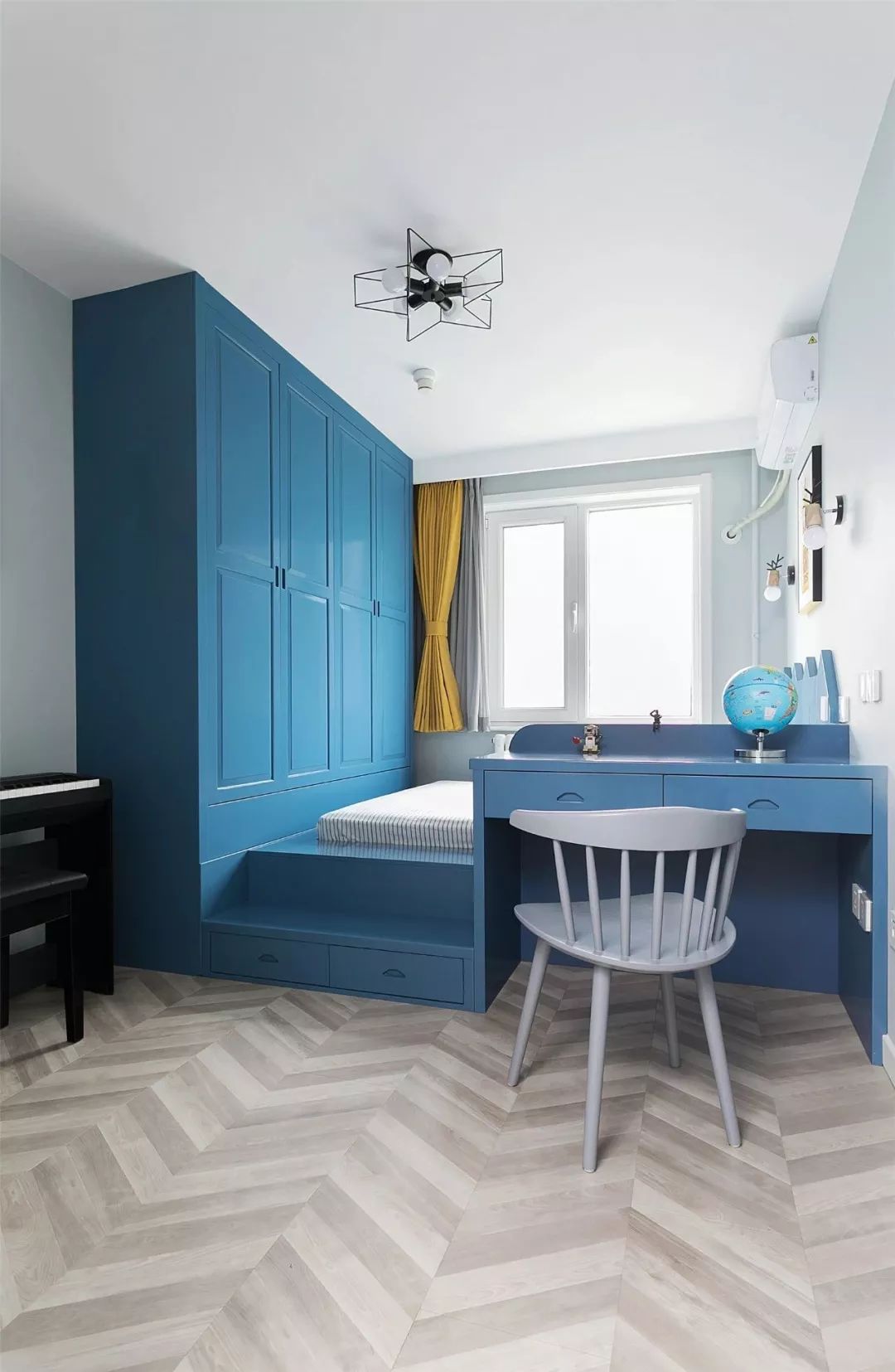 ▲ 儿童房定制了宝蓝色的衣柜与榻榻米,并在榻榻米边上嵌入了一个书桌,使空间更加宽敞,满足玩耍的活动空间及电子钢琴的放置。