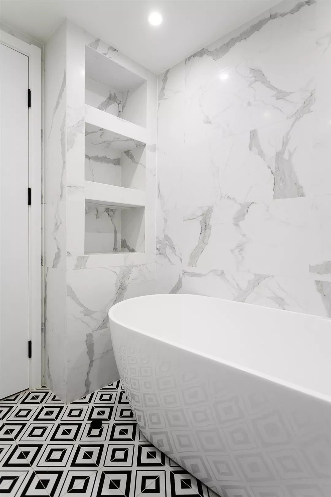 ▲ 卫生间还设计了浴缸,想想累了一天泡个澡,扫除一天的疲惫,美美的睡一觉,很是享受,浴缸一侧的墙面还设计了壁龛,可以放洗漱用品,很实用。