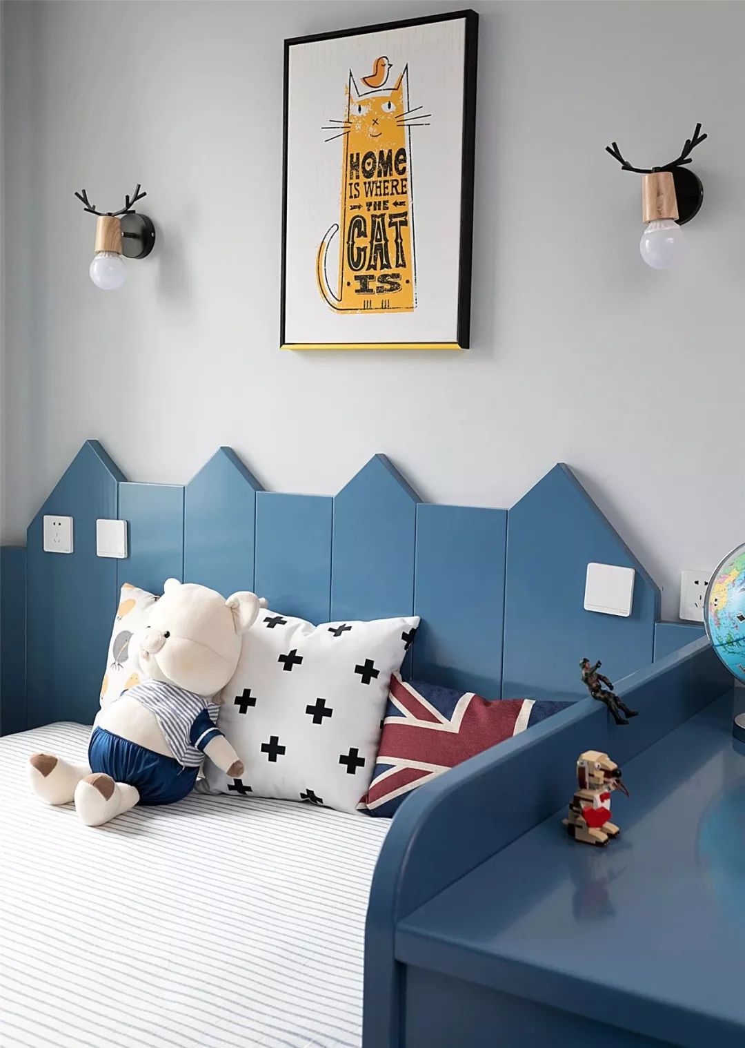 ▲ 床头墙很有特色,类似屋顶的造型设计,中间一副动物挂画,两边是鹿角壁灯设计,充满了童趣。
