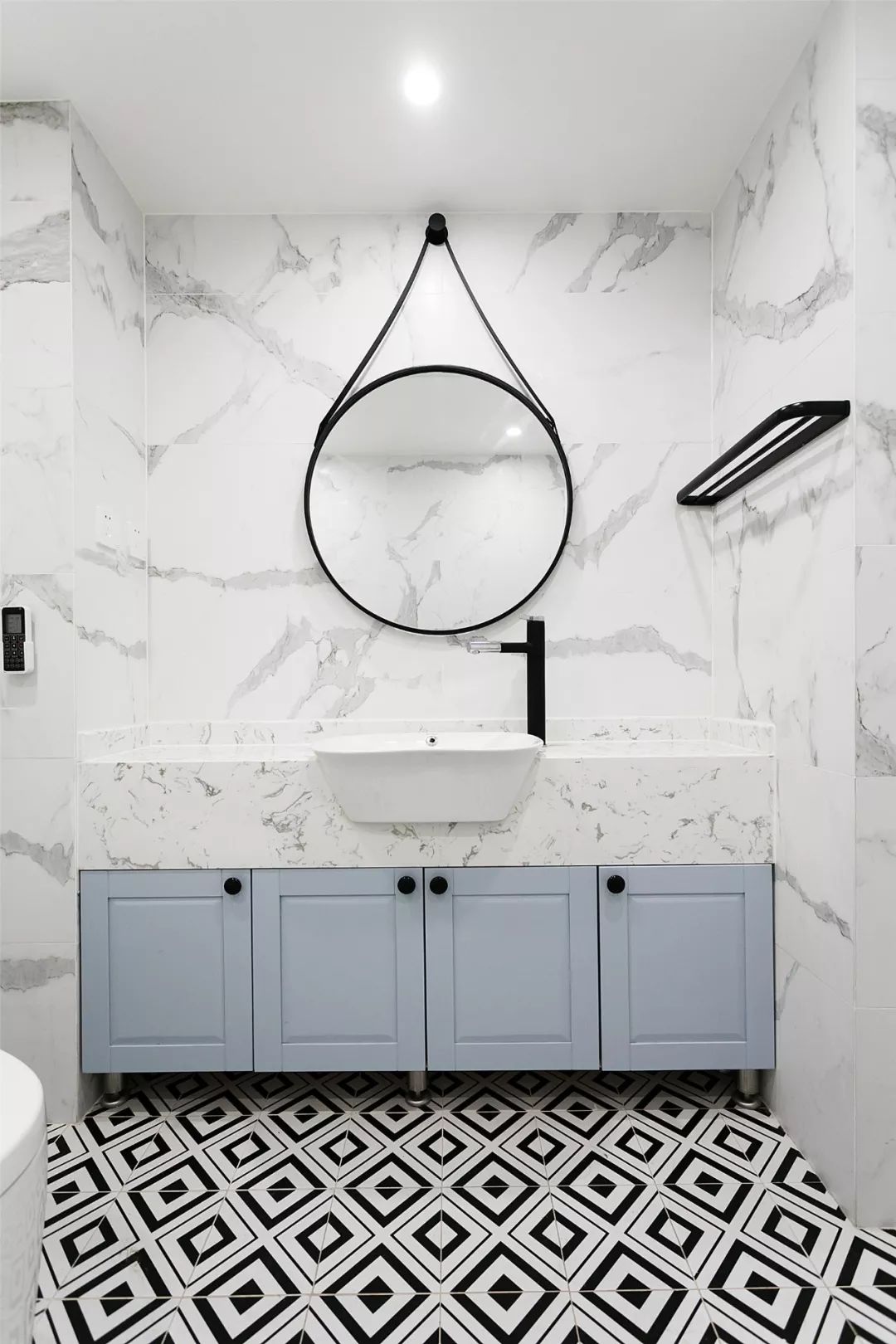 ▲卫生间以黑白两色为基调,局部加入灰蓝色,整体明快简约。
