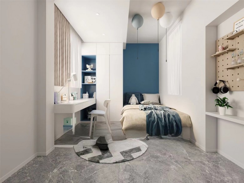 男孩房用原来的门洞做了一个洞洞板,还有隔板,给孩子放东西。孩子小,短期不会自己睡,与主卧相连的地方挂了窗帘。空间面积有限,8平方的房间只能放1.2的床,勉强用吧。