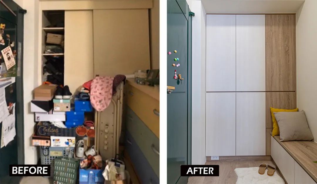 原来的鞋柜深度太深,取放东西不方便。新做的鞋柜调整了鞋柜深度,并做到顶,很容易放置衣服或其他物品。