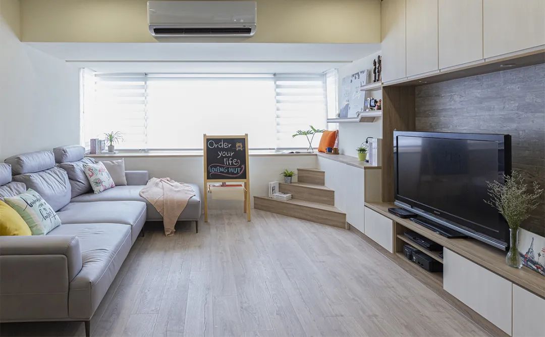 将原来的客厅瓷砖换成木板,加上阳光的照射,整个空间明亮舒适。