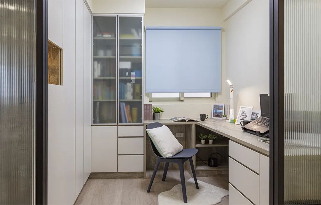 将正对大门的鞋柜换成凳子,透过压低高度使视野获得延伸,消除狭隘空间的压迫感,同时收纳量丝毫不会受到影响。