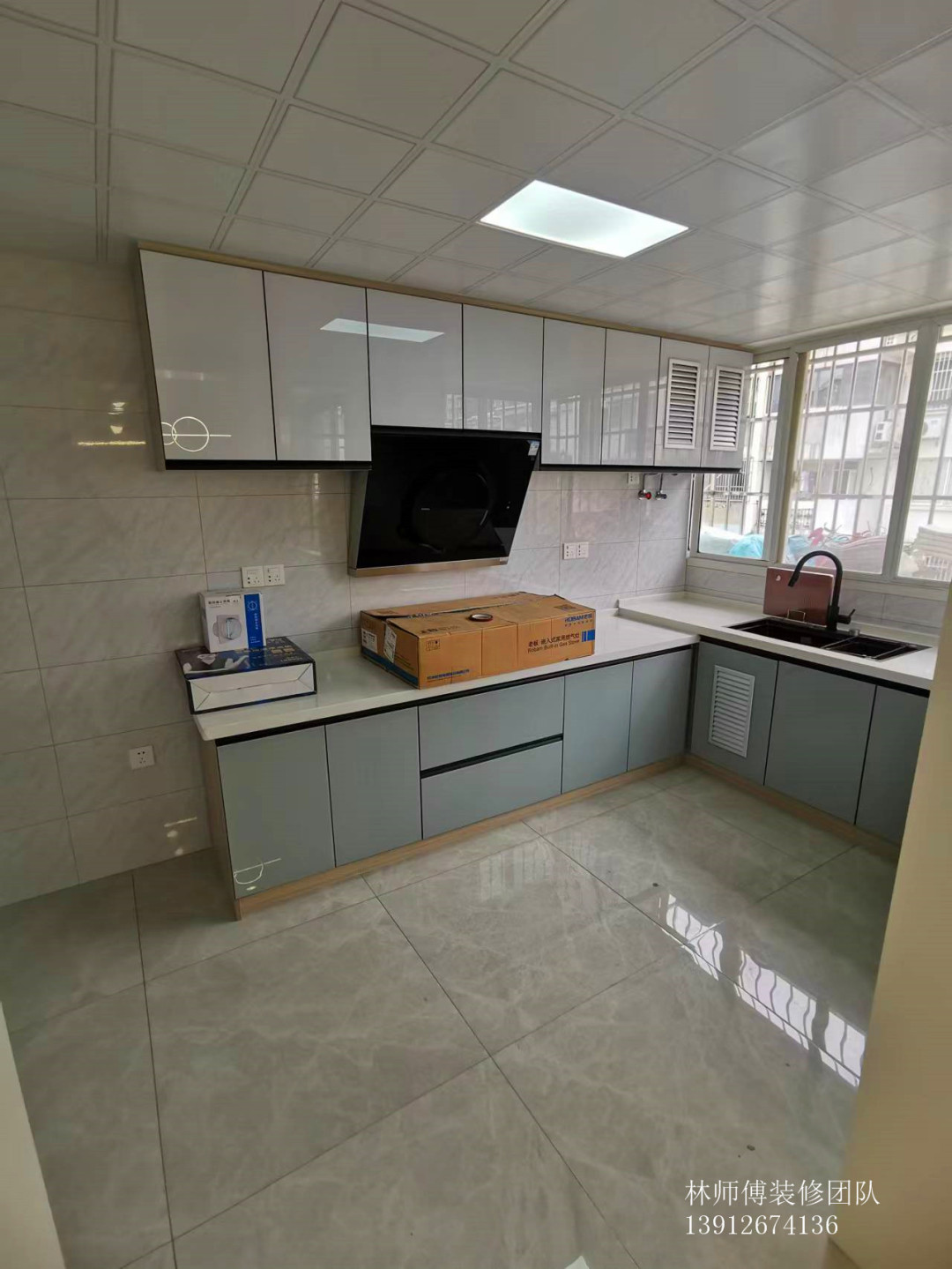 厨房一点也不拥挤,还能容下一个双门大冰箱。而且上下也都做了柜子,收纳能力非常强,雾霾蓝+白色的搭配,让厨房看起来清清爽爽。高低台面又方便洗菜和烹饪,符合人体学,配菜做饭都不累。