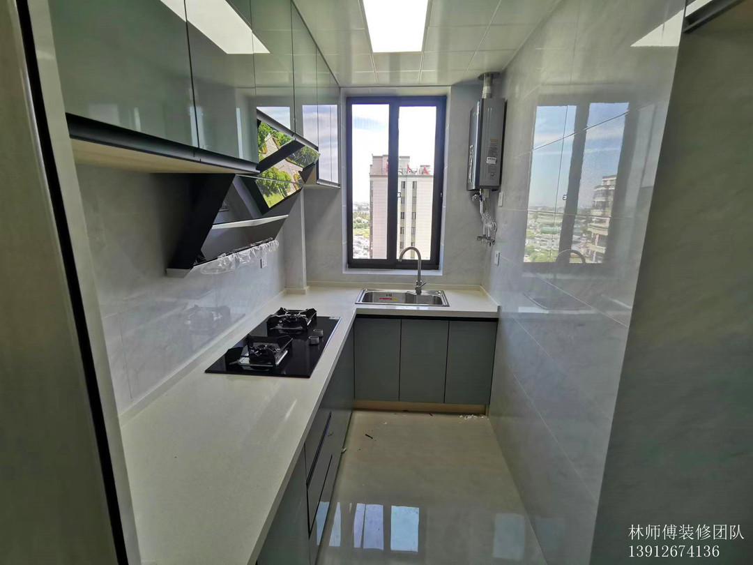厨房是L型设计,上下橱柜增加收纳能力。小清新的颜色也让整个厨房看起来更加清爽干净。侧吸油烟机不容易碰头哦~