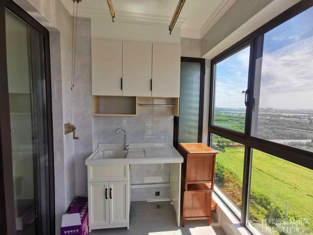 阳台光线很好,大大的落地窗,视野广阔。洗衣柜的设计也很实用,既可以放,又可以晾。