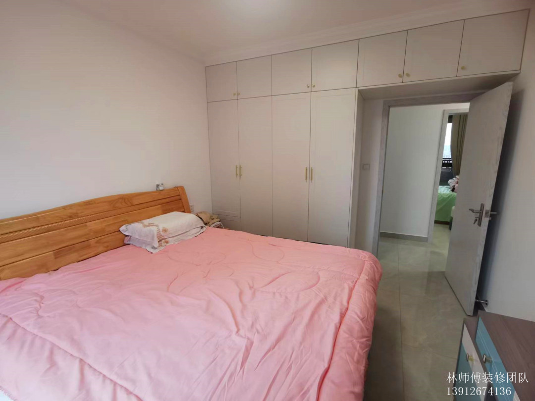 主卧干净整洁,白色橱柜+原木双人床,素雅柔和,非常适合休息。床尾还有女主人的化妆桌哦~