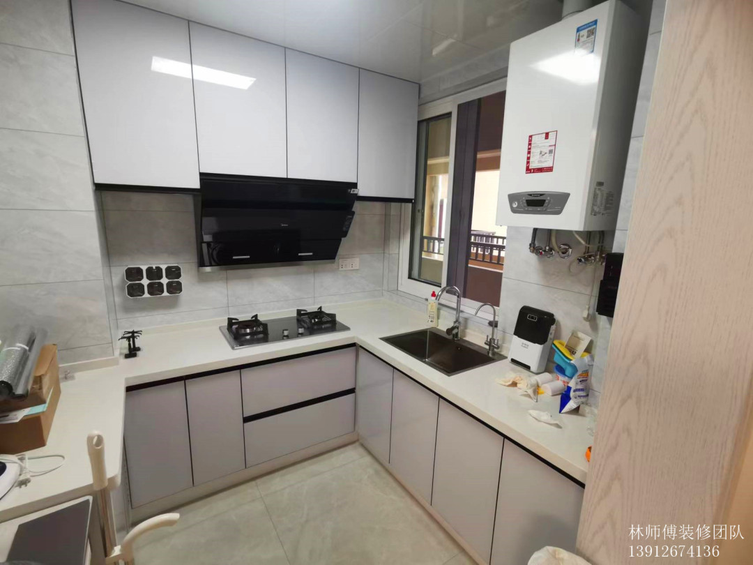 厨房也是以白色为主,更加清爽干净,u型设计储物能力超强,基本上所有东西都可以收纳到柜子里,保持台面整洁。