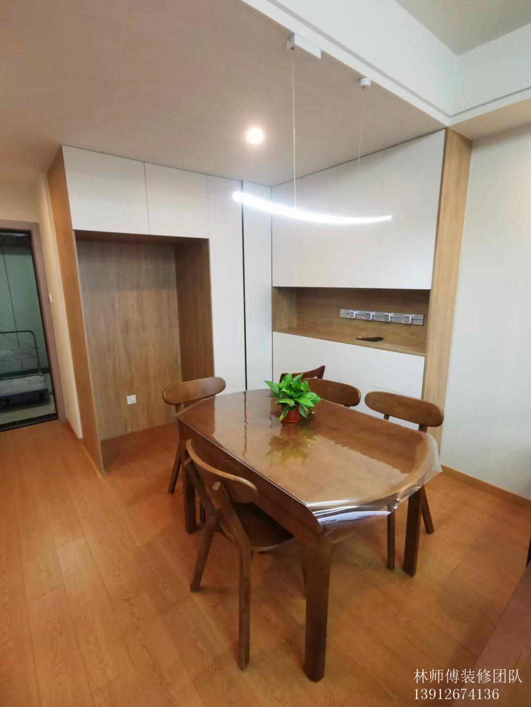这是一个进门没有玄关的户型,客餐厅在一个空间内,进门后,左边就是餐厅,右边就是厨房。